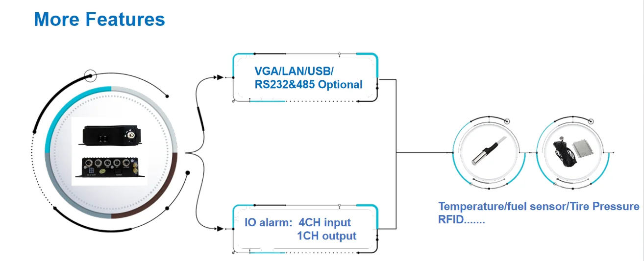 √8CH 1080P/720P H.265 recording √Support HDD(SSD) 2TB*1+ SD Storage MAX 512G*2 √Integrated 16GB EMMC storage √4G Optional for online fleet management platform √WIFI (Optional) for data transmission or I-vehicle APP(Debug APP) √Basic RS232*3 ,RS485*1, LAN*1,USB*2 , (VGA and CAN optional) √Support RFID/Fuel sensor/Tire pressure monitor/temperature sensor customized...., √ADAS/DSM/BSD/APC/HOD/3D 360AWM AI function optional (DSM support Face ID+Seat-belt) √Built-in G-sensor support abnormal vibrations/rollover/collision/ sudden braking /will alarm and upload platform automatically √IO Alarm: 10CH input 2CH output √Relay cut remote cut-off power/oil √Support GPS upload after the vehicle is powered off √Integrated MIC and speaker; supports TTS and voice broadcasting, √Free Hetu Software for fleet management √Operation: remote controller,USB Mouse,Mobile APP,CMS remotely √Power supply: Support 8V-36V. (Delay-off time 24H) √Size:196(W) mmx60(H)mm x188(D)mm