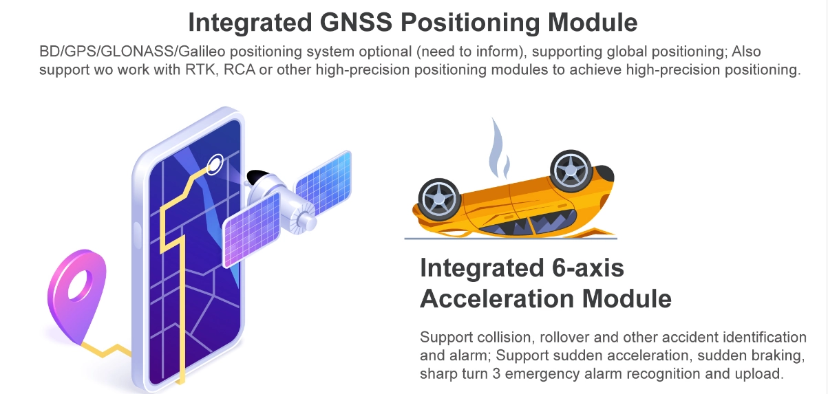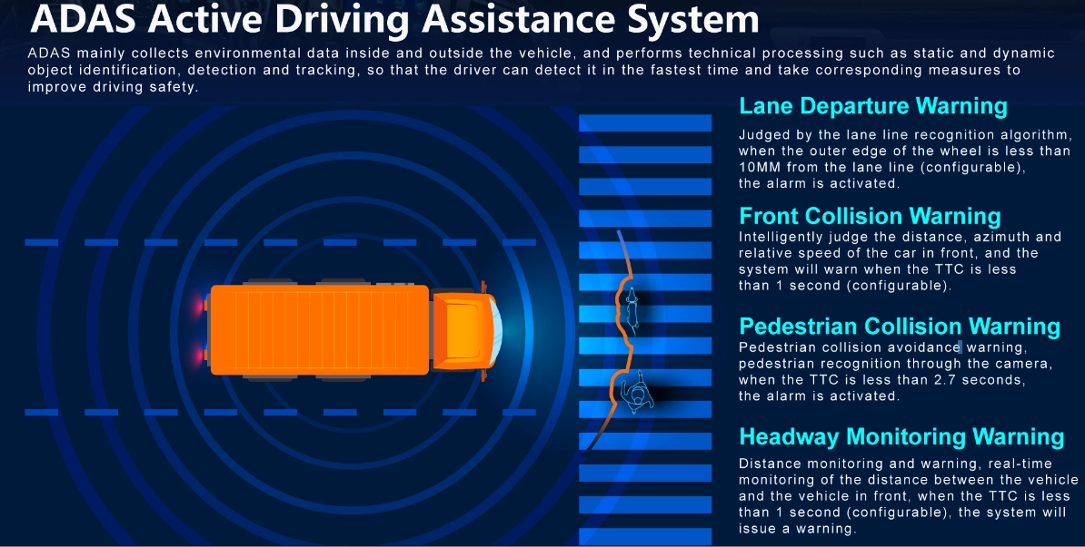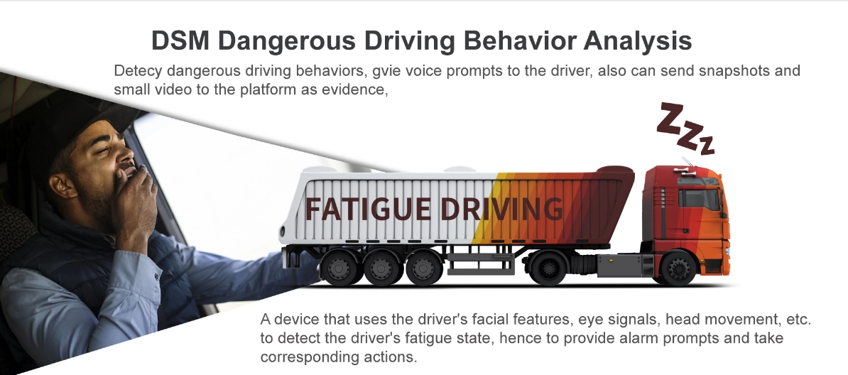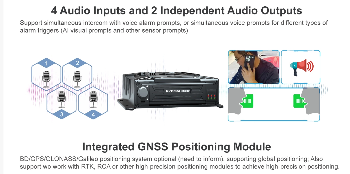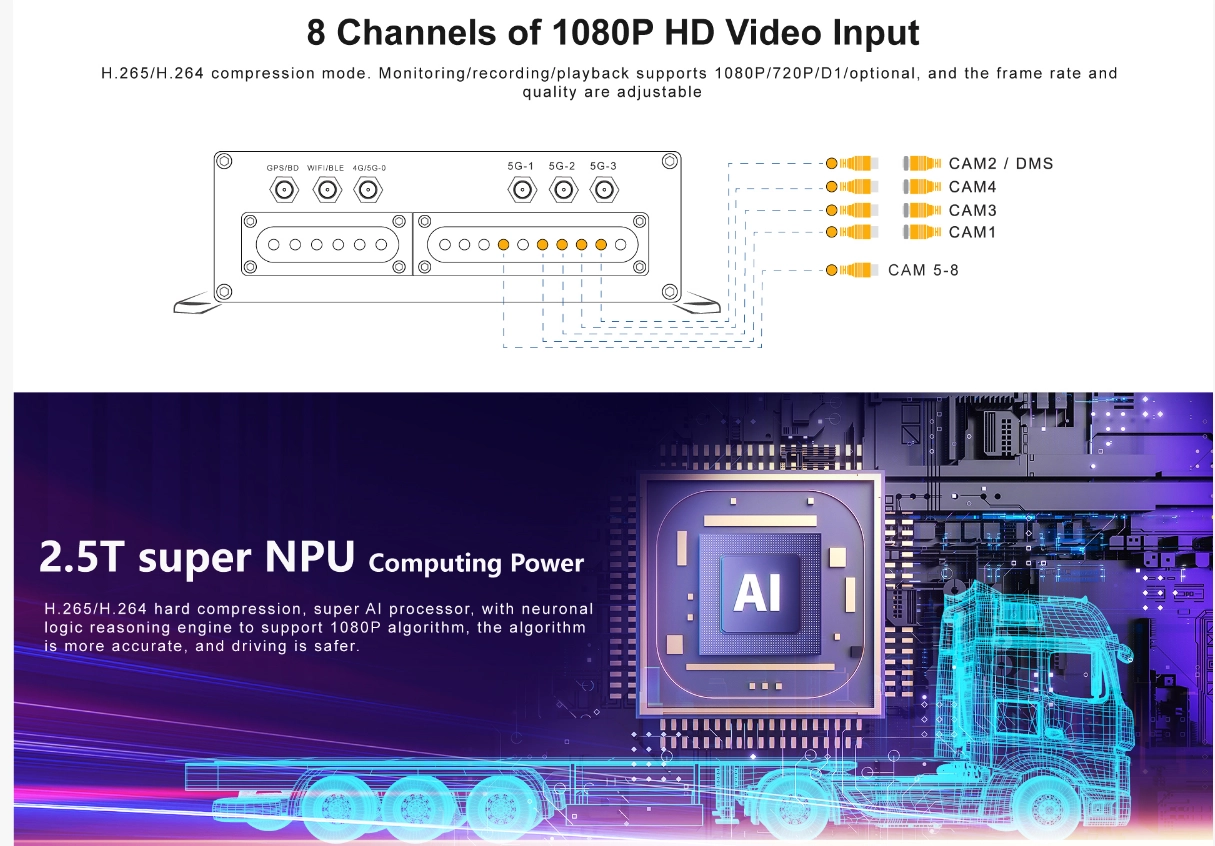① H.265/H.264 hardware compression, powerful AI processor, with neuronal logic reasoning engine, support for deep learning algorithms. ② Integrated ADAS camera, can expand 1-2 AI camera input. Support DSM and environmental monitoring. ③ ADAS assist driving function——Integrated with ADAS camera, advanced auxiliary driving warning function can be realized (supporting lane departure detection and warning, front-vehicle collision detection and warning, vehicle proximity warning, etc.) ④ DMS camera driving behavior analysis——It can connect the DMS camera to give alarm warning and upload to the monitoring center for dangerous driving behaviors of drivers, including: fatigue (closing eyes, yawning), distraction, smoking, talking on the phone, etc ⑤ Driver face recognition function——Face recognition attendance on the basis of management can also prevent the driver illegal substitution, non-compliance of the driver operation of the problem, standardize the driver and operation management. ⑥ Beidou /GPS positioning, support the ministry of JT/T808, JT/T1076, JT/T905, Geely, Su Biao and other platforms to report transmission.