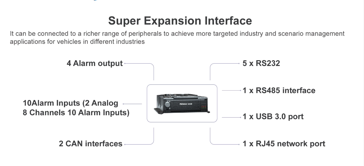 √8CH 1080P/720P H.265 recording √Waterproof and anti-vandal AI MDVR IP67 √SD Storage MAX 512G*2 (SSD Optional) √4G Optional for online fleet management platform √With WIFI for data transmission or I-vehicle APP(Debug APP) √Basic RS232*5 ,RS485*1,USB*2 , CAN*2 √Support RFID/Fuel sensor/Tire pressure monitor/temperature sensor customized...., √ADAS/DSM/BSD/3D 360AWM AI function optional (DSM support Face ID+Seat-belt) √Built-in G-sensor support abnormal vibrations/rollover/collision/harsh acceleration harsh braking/harsh cornering alarms and upload platform automatically √IO Alarm: 10CH input 2CH output √Relay cut remote cut-off power/oil √Support GPS upload after the vehicle is powered off √Integrated MIC; supports TTS and voice broadcasting, √Free Hetu Software for fleet management √Integrated supercapacitor can keep the device running after a power outage, ensuring continuous data. √Monitor/Relay/Speed sensor/Audible alarm/ LED warning lights/Safety belt sensor/Alarm display /Cargo over-height identification instrument/Electronic throttle governor these parts optional √Operation: remote controller,USB Mouse,Mobile APP,CMS remotely √Power supply: Support 8V-36V. (Delay-off time 24H) DC11~120V for forklift √Size:186mm*53mm*174mm