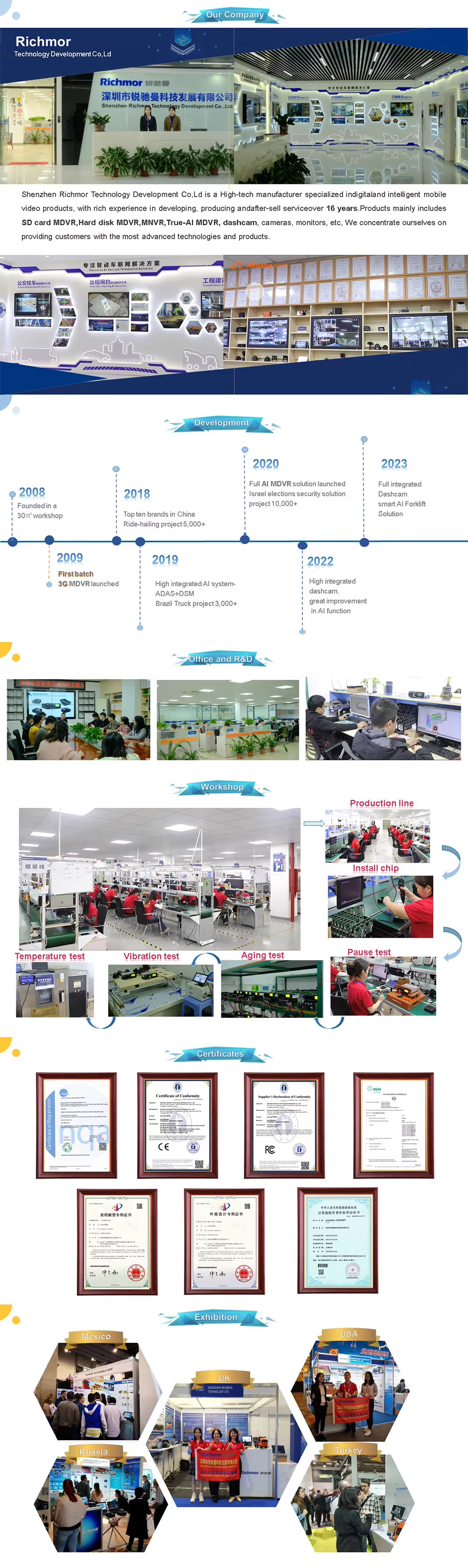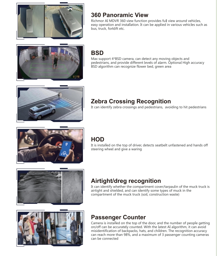 ① H.265/H.264 hardware compression, powerful AI processor, with neuronal logic reasoning engine, support for deep learning algorithms. ② Integrated ADAS camera, can expand 1-2 AI camera input. Support DSM and environmental monitoring. ③ ADAS assist driving function——Integrated with ADAS camera, advanced auxiliary driving warning function can be realized (supporting lane departure detection and warning, front-vehicle collision detection and warning, vehicle proximity warning, etc.) ④ DMS camera driving behavior analysis——It can connect the DMS camera to give alarm warning and upload to the monitoring center for dangerous driving behaviors of drivers, including: fatigue (closing eyes, yawning), distraction, smoking, talking on the phone, etc ⑤ Driver face recognition function——Face recognition attendance on the basis of management can also prevent the driver illegal substitution, non-compliance of the driver operation of the problem, standardize the driver and operation management. ⑥ Beidou /GPS positioning, support the ministry of JT/T808, JT/T1076, JT/T905, Geely, Su Biao and other platforms to report transmission.Happy new year 2024 -Richmor team