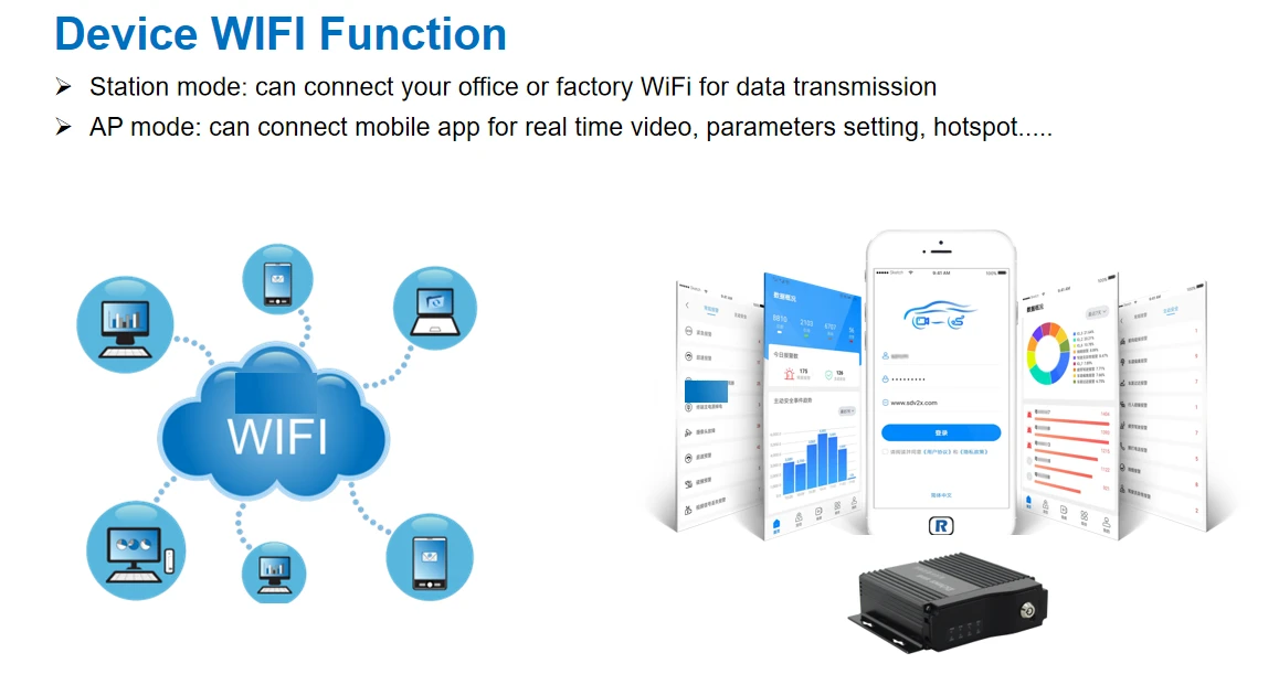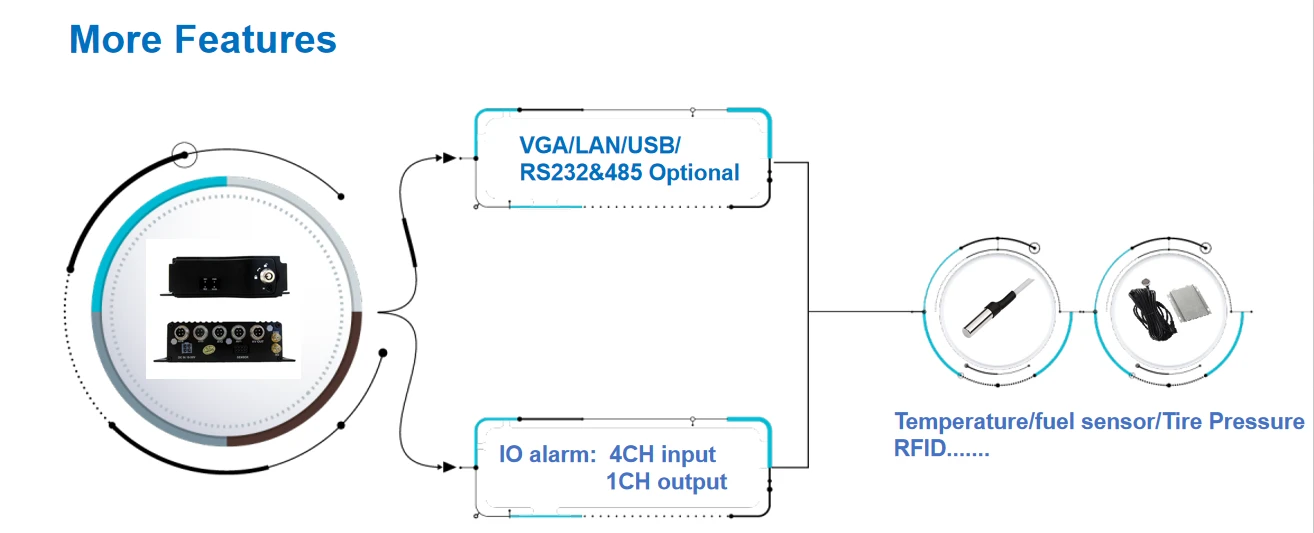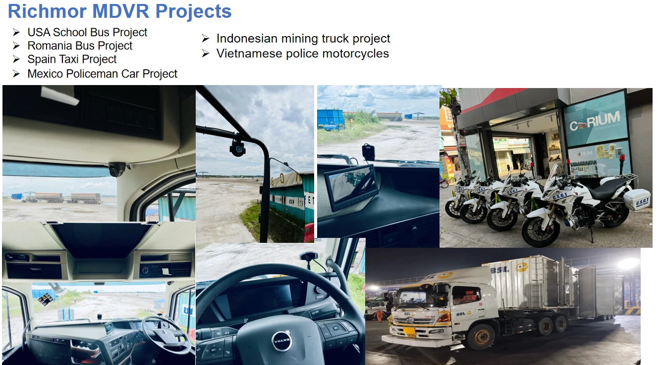√8CH 1080P/720P H.265 recording √Waterproof and anti-vandal AI MDVR IP67 √SD Storage MAX 512G*2 (SSD Optional) √4G Optional for online fleet management platform √With WIFI for data transmission or I-vehicle APP(Debug APP) √Basic RS232*5 ,RS485*1,USB*2 , CAN*2 √Support RFID/Fuel sensor/Tire pressure monitor/temperature sensor customized...., √ADAS/DSM/BSD/3D 360AWM AI function optional (DSM support Face ID+Seat-belt) √Built-in G-sensor support abnormal vibrations/rollover/collision/harsh acceleration harsh braking/harsh cornering alarms and upload platform automatically √IO Alarm: 10CH input 2CH output √Relay cut remote cut-off power/oil √Support GPS upload after the vehicle is powered off √Integrated MIC; supports TTS and voice broadcasting, √Free Hetu Software for fleet management √Integrated supercapacitor can keep the device running after a power outage, ensuring continuous data. √Monitor/Relay/Speed sensor/Audible alarm/ LED warning lights/Safety belt sensor/Alarm display /Cargo over-height identification instrument/Electronic throttle governor these parts optional √Operation: remote controller,USB Mouse,Mobile APP,CMS remotely √Power supply: Support 8V-36V. (Delay-off time 24H) DC11~120V for forklift √Size:186mm*53mm*174mmNew Upgrade: Richmor Fleet Management Platform 3.0