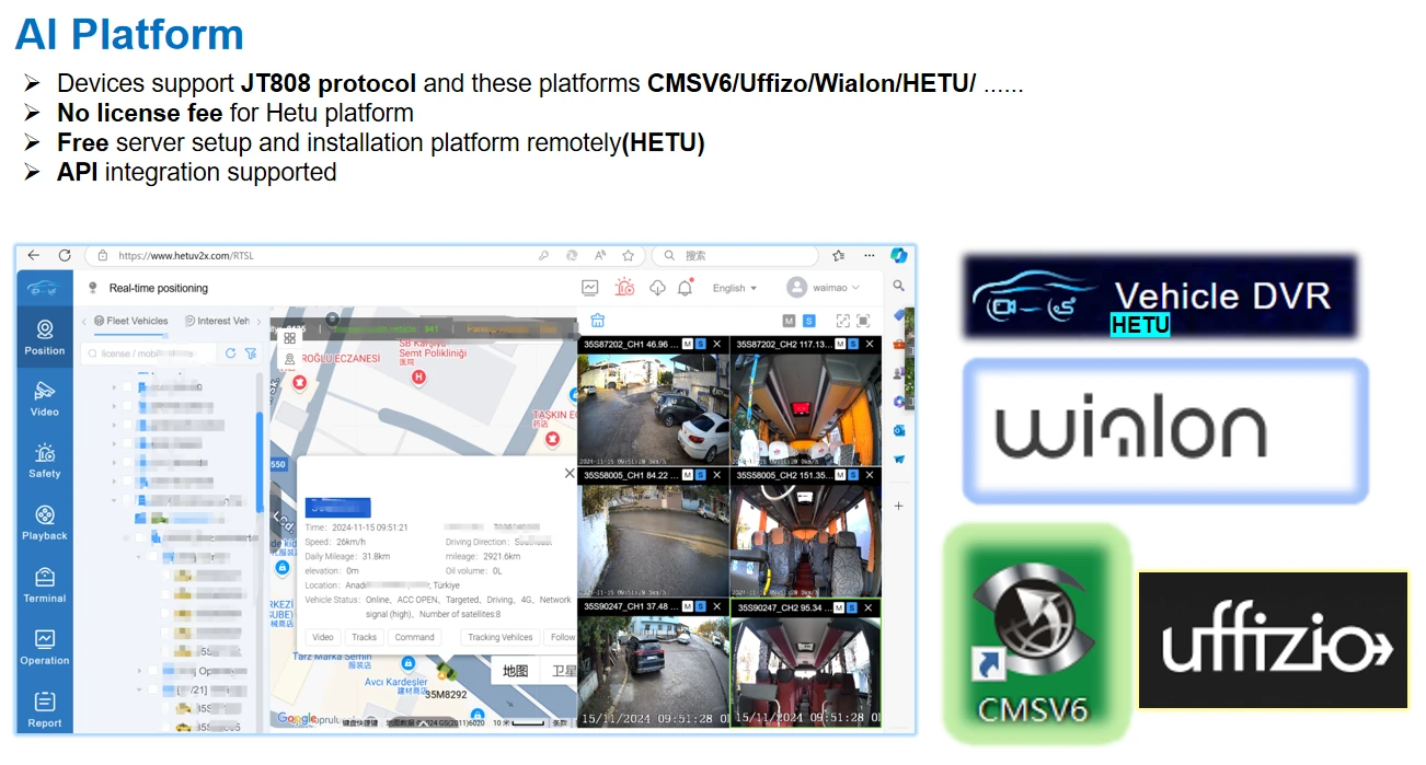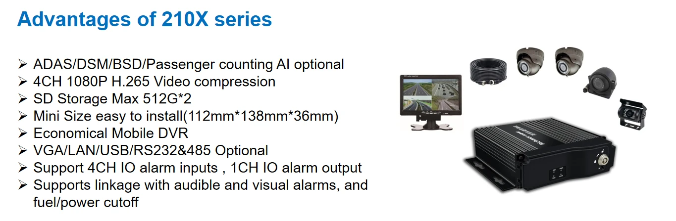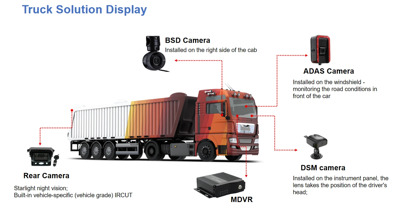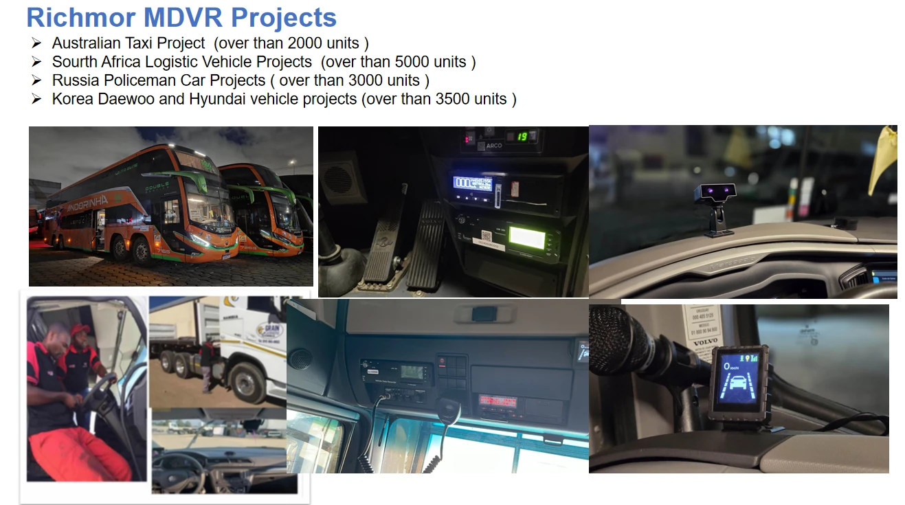 ① H.265/H.264 hardware compression, powerful AI processor, with neuronal logic reasoning engine, support for deep learning algorithms. ② Integrated ADAS camera, can expand 1-2 AI camera input. Support DSM and environmental monitoring. ③ ADAS assist driving function——Integrated with ADAS camera, advanced auxiliary driving warning function can be realized (supporting lane departure detection and warning, front-vehicle collision detection and warning, vehicle proximity warning, etc.) ④ DMS camera driving behavior analysis——It can connect the DMS camera to give alarm warning and upload to the monitoring center for dangerous driving behaviors of drivers, including: fatigue (closing eyes, yawning), distraction, smoking, talking on the phone, etc ⑤ Driver face recognition function——Face recognition attendance on the basis of management can also prevent the driver illegal substitution, non-compliance of the driver operation of the problem, standardize the driver and operation management. ⑥ Beidou /GPS positioning, support the ministry of JT/T808, JT/T1076, JT/T905, Geely, Su Biao and other platforms to report transmission.Happy new year 2024 -Richmor team