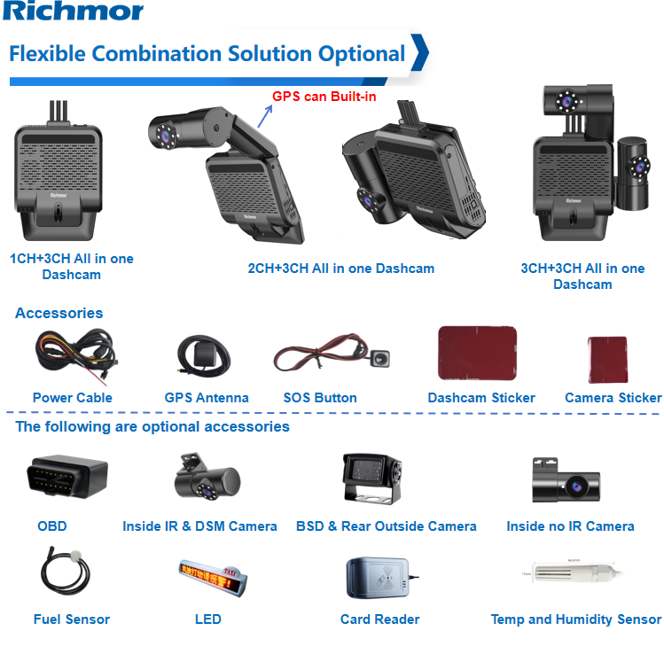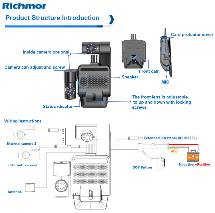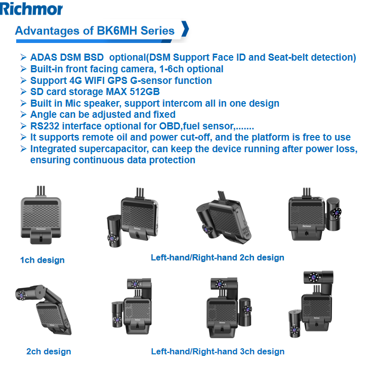 RCM-BK6MJ is Richmor 6th generation professional AI-powered ADAS design dashcam with DSM optional. This camera design is much better fitted (100%) front windscreen installation without reflection than the traditional fitted design. One built-in ADAS camera with lens can be vertically adjusted and fixed. Can flexibly add 1 to 3 cameras. Different combination for quick setup in different cases.