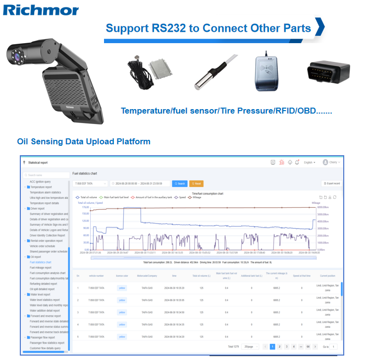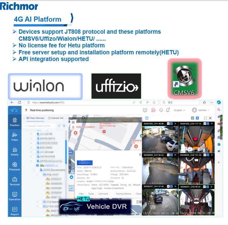 √8CH 1080P/720P H.265 recording √Waterproof and anti-vandal AI MDVR IP67 √SD Storage MAX 512G*2 (SSD Optional) √4G Optional for online fleet management platform √With WIFI for data transmission or I-vehicle APP(Debug APP) √Basic RS232*5 ,RS485*1,USB*2 , CAN*2 √Support RFID/Fuel sensor/Tire pressure monitor/temperature sensor customized...., √ADAS/DSM/BSD/3D 360AWM AI function optional (DSM support Face ID+Seat-belt) √Built-in G-sensor support abnormal vibrations/rollover/collision/harsh acceleration harsh braking/harsh cornering alarms and upload platform automatically √IO Alarm: 10CH input 2CH output √Relay cut remote cut-off power/oil √Support GPS upload after the vehicle is powered off √Integrated MIC; supports TTS and voice broadcasting, √Free Hetu Software for fleet management √Integrated supercapacitor can keep the device running after a power outage, ensuring continuous data. √Monitor/Relay/Speed sensor/Audible alarm/ LED warning lights/Safety belt sensor/Alarm display /Cargo over-height identification instrument/Electronic throttle governor these parts optional √Operation: remote controller,USB Mouse,Mobile APP,CMS remotely √Power supply: Support 8V-36V. (Delay-off time 24H) DC11~120V for forklift √Size:186mm*53mm*174mmNew Upgrade: Richmor Fleet Management Platform 3.0